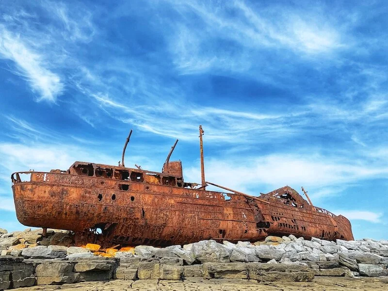 On Sunday, we drove north and caught a ferry over to Inishear. We rented bikes and circled the whole island in search of sheep. Weirdly, we found none, but we met many horses and cows along the way. We set off for lunch only to discover that the one open pub had no food (except a bag of crisps). We drank a Guinness and set back off. On our way up to the castle ruins, we spotted a B&B that was serving lunch. There a woman served us fresh crab legs at a picnic table in her yard surrounded by chickens. It was hilarious and delicious. From there we headed out on the far side of the island where there is a ship that was wrecked on shore. It’s just sitting there, so you can walk all around and in it. The sky way so blue and the rust on the ship was so red – it was absolutely stunning. And also cold.